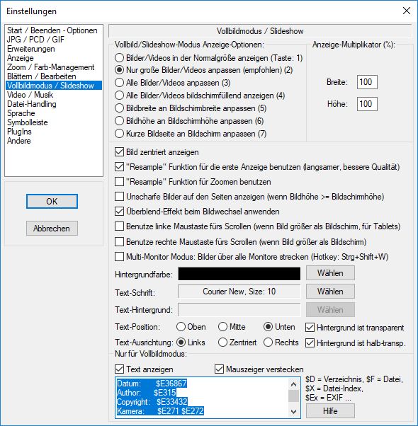 - Taste E: Aktivieren des gesamten EXIF Fensters in der Ansicht