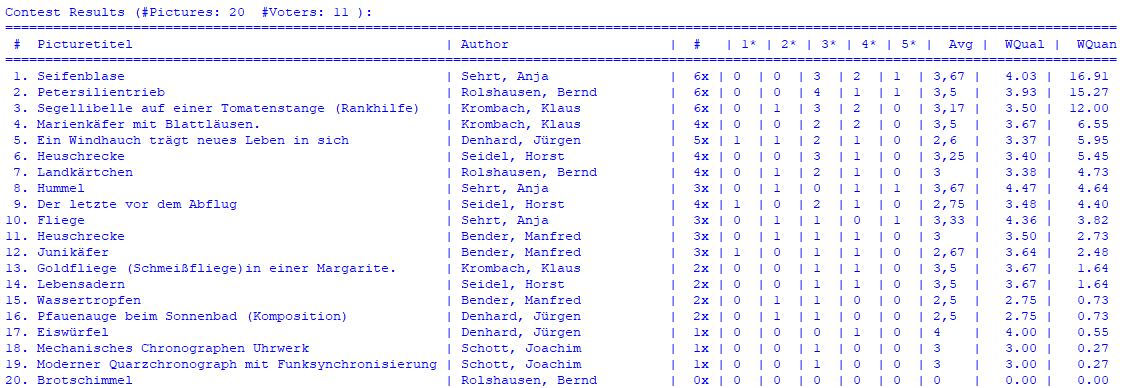 Detaillierte Übersicht über alle Wettbewerbsbilder und ihrer Bewertung: